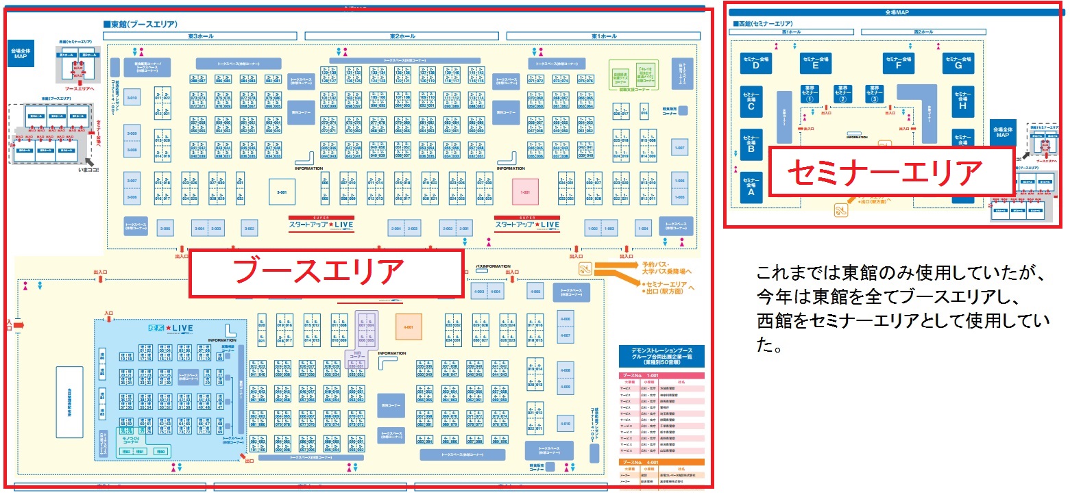 今期1回目となるリクナビLIVEは、3/7に東京ビッグサイトにて開催された。 参加企業数は昨対比186%の525社と大幅に増加したことに対し、学生数は昨対比103%の20,261名と大きな変化はなかった。 その影響もあってか、平均着席数(各企業ブースに着席した学生の平均人数)は昨対比48%の179名と大幅に減少した。 16rikunabi 16卒リクナビLIVE 2015/3/7 学生動員数:20,261名(文系15789名・理系4472名 ) 参加企業数:525社 平均着席数:179名 総合満足度:44.7% 15卒リクナビLIVE 2013/12/7 学生動員数:19,627名(文系16252名・理系3375名 ) 参加企業数:282社 平均着席数:374名 満足度:78.7% 14卒リクナビLIVE 2012/12/1 学生動員数:15,798名(文系12797名・理系3001名 ) 参加企業数:241社 平均着席数:373名 満足度:59.5% IMG_6409 会場となった東京ビッグサイト(東京国際展示場)。 今年は企業数が増えたことにより、東展示棟、西展示棟の両方を使用していた(昨年は東展示棟のみ)。 map