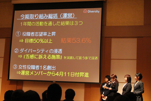 メンバーは女性役職者と、アンケートで上位職志望の意思表示をした一般職の女性社員を中心に指名制で選び、営業部毎に8チームに分けました。各チームが女性役職者を育成や女性の定着採用を行うための施策を考え、営業部長に提案し、承認されたら施策を実施し、最後に成果報告会を開催するという1年間のプロジェクトでした。