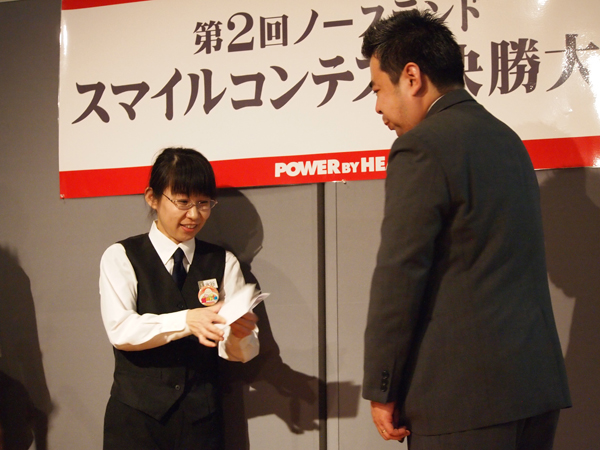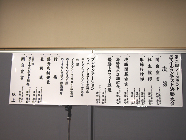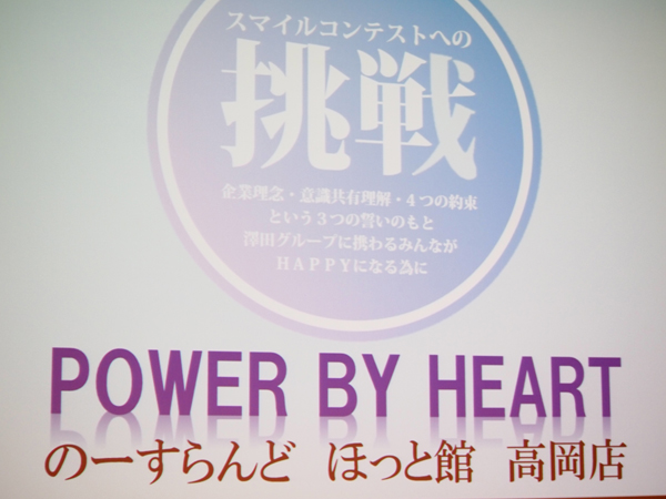 「スマイルプロジェクト」で行ってきた取り組みの成果を経営陣が評価し、全23店舗の中から選ばれた上位5店舗が自店の取り組みをプレゼンし、最優秀賞を競うというものです。 「スマイルプロジェクト」 企業理念の基、ノースランドに関わる全ての方々にスマイルでハッピーになっていただきたい。また、長い人生のなかで「生き方や考え方」等をノースランドで働いていくことで学び、「スマイルでハッピーな人生を歩んでいる」と全スタッフが誇れる企業を目指すプロジェクトです。 プロジェクトの概要は、お客様に喜んでいただくための店舗づくりや、業務を円滑に進めるためのオペレーションなどの、提案と改善。 接客調査の開催や、よりよいサービスを行うためのディスカッションなど、さまざまな取り組みが行われています。スマイルプロジェクトのテーマは「感謝と対話」