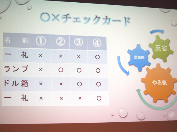 これはホール業務中に、スタッフ同士がお互いをチェックするというものです。お互いに誰がチェック担当かはわからないようになっているので、緊張感も増すそうです。